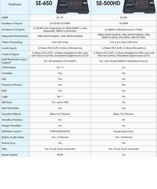 سوئیچر SE-500HD دارای ویژگی هایی مانند Lumakey  برای پوشش های گرافیکی ، تقسیم صفحه برای مصاحبه های پادکست و PIP  برای ارائه PowerPoint است.