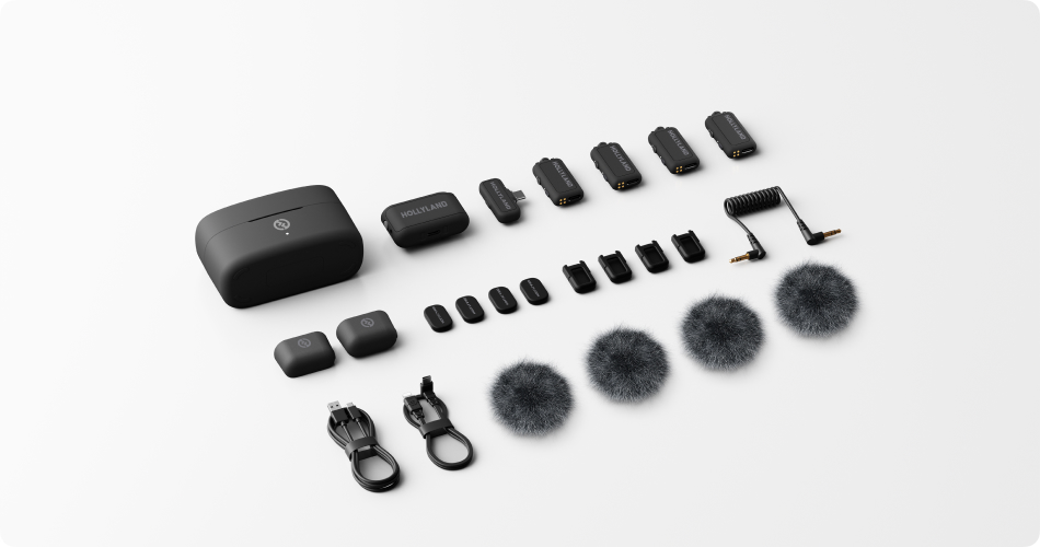 - Ultimate Combo : شامل دو میکروفون، یک گیرنده USB-C، دو قطعه تبدیل USB-C به 3.5mm، دو میکروفون اکسترنال، یک گیرنده دوربین، یک کابل تبدیل USB-C به Lightning، کیس شارژر، دو میکروفون اکسترنال سیمی، دو هدفون، کیس شارژر هدفونها، بادگیر، دو آهنربا، دو قاب آهنربایی میکروفونها، کابل شارژ و دو مدل کابل TRS جهت اتصال به دوربین.