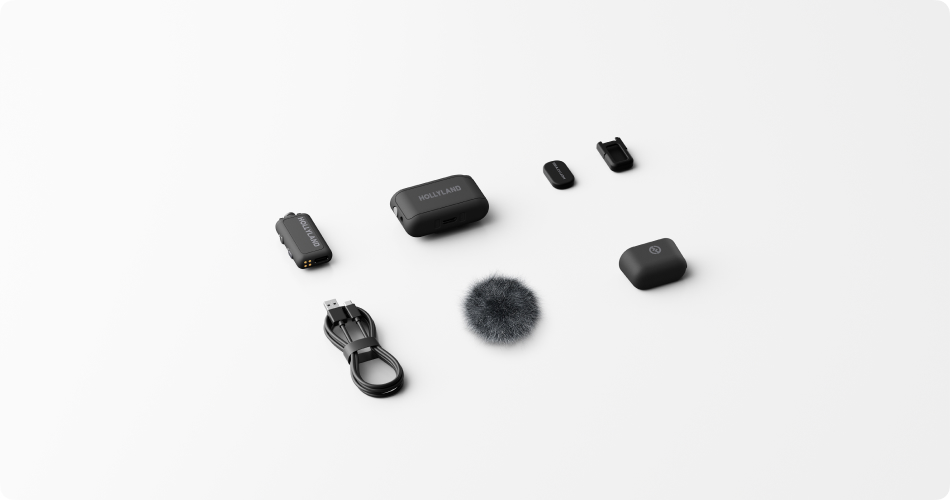 - Solo : شامل یک میکروفون، یک قطعه تبدیل USB-C به 3.5mm، یک گیرنده دوربین، بادگیر، یک آهنربا، یک قاب آهنربایی میکروفونها، کابل شارژ و یک کابل TRS جهت اتصال به دوربین.