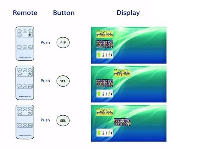 به وسیله سوئیچ HDMI ویکینگ، همزمان با یک برنامه یا کانال که در صفحه کامل نمایش نشان داده میشود، یک یا چند برنامه دیگر نیز در inset نمایش داده میشود-(ویندوز). با این حال شما صدا را فقط از برنامه اصلی میشنوید. این موضوع به شما این امکان را میدهد که شما در نمایشگر اصلی Xbox یا PS خود را بازی کنید زمانیکه در حال تماشای تلویزیون، فیلم یا برنامه دیگر در نمایشگر دوم هم میباشید. محصول سوئیچ 4 پورت HDMI ویکینگ از حداکثر 3 صفحه نمایش فرعی (sub-screens) در یک زمان پشتیبانی میکند بنابراین شما می توانید 4 چیز دیگر را در یک زمان همزمان با اینکه در صفحه اصلی هستید، تماشا کنید.